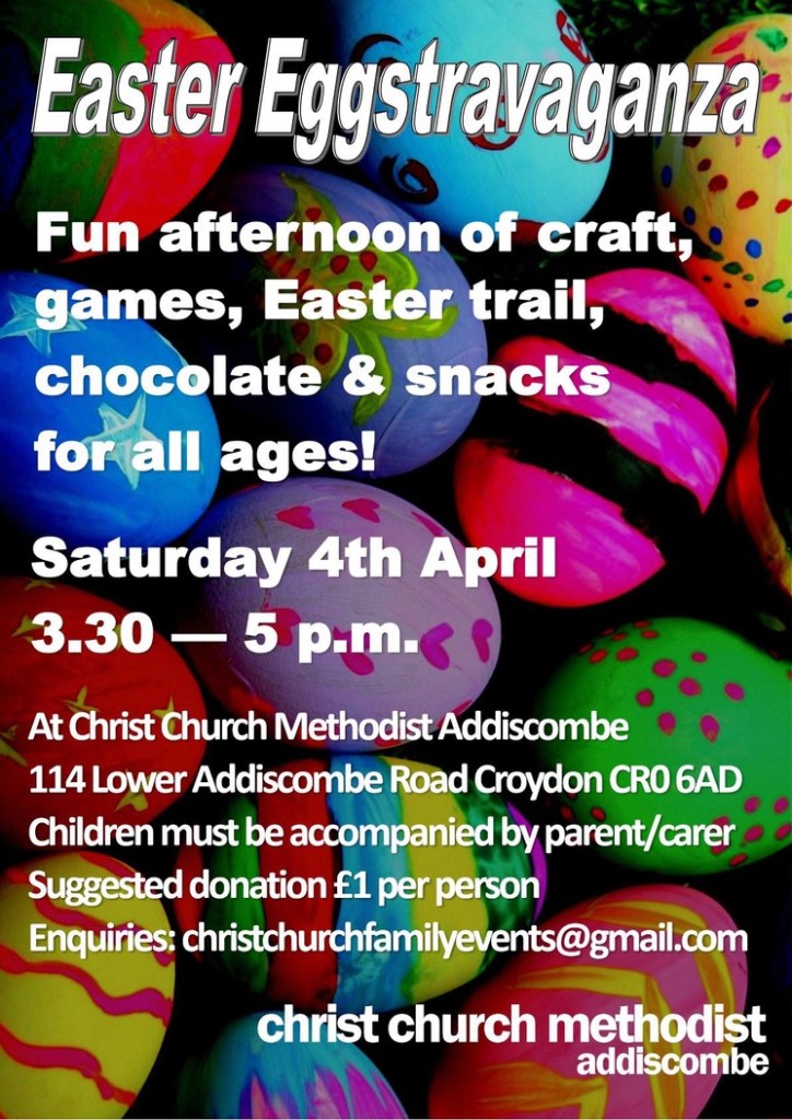Easter Eggstravaganza 3.30pm Saturday, 4 April at Christ Church, 114 Lower Addiscombe Road #croydon Apr 2, 2026 · by eastcroydon · in Faith & Charity, Family & Education. · More information https://www.facebook.com/ChristChurchAddiscombe Share this: Share on X (Opens in new window) X Share on Facebook (Opens in new window) Facebook Share on Bluesky (Opens in new window) Bluesky Share on Nextdoor (Opens in new window) Nextdoor Like Loading... Related