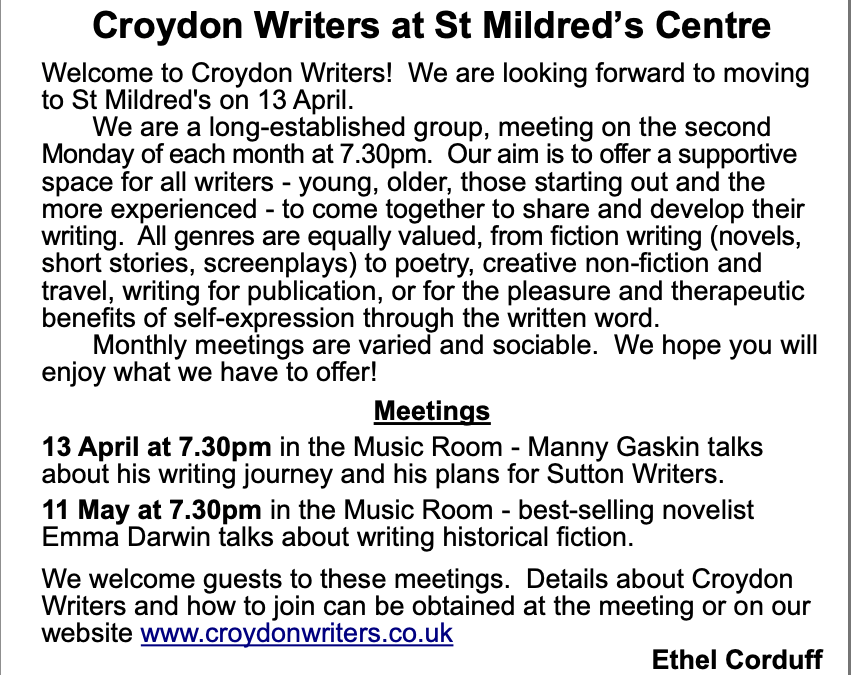 Manny Gaskin talks about his writing journey 7.30pm Monday, 13 April at St Mildred’s, 30 Bingham Road #croydon Apr 12, 2026 · by eastcroydon · in Sport & Leisure, Uncategorized. · More information https://croydonwriters.co.uk Share this: Share on X (Opens in new window) X Share on Facebook (Opens in new window) Facebook Share on Bluesky (Opens in new window) Bluesky Share on Nextdoor (Opens in new window) Nextdoor Like Loading... Related