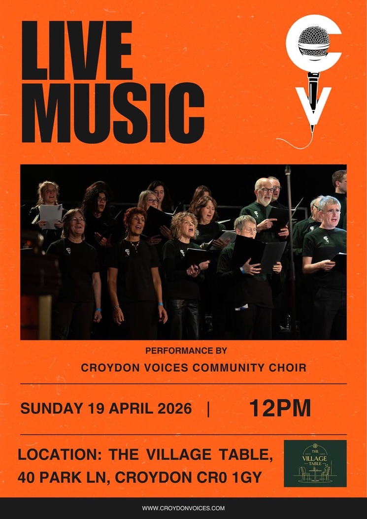 Croydon Voices Community Choir, 12 pm Sunday, 19 April at The Village Table, Queens Gardens #croydon Apr 18, 2026 · by eastcroydon · in Sport & Leisure. · More information https://www.instagram.com/thevillagetable_uk/ Share this: Share on X (Opens in new window) X Share on Facebook (Opens in new window) Facebook Share on Bluesky (Opens in new window) Bluesky Share on Nextdoor (Opens in new window) Nextdoor Like Loading... Related