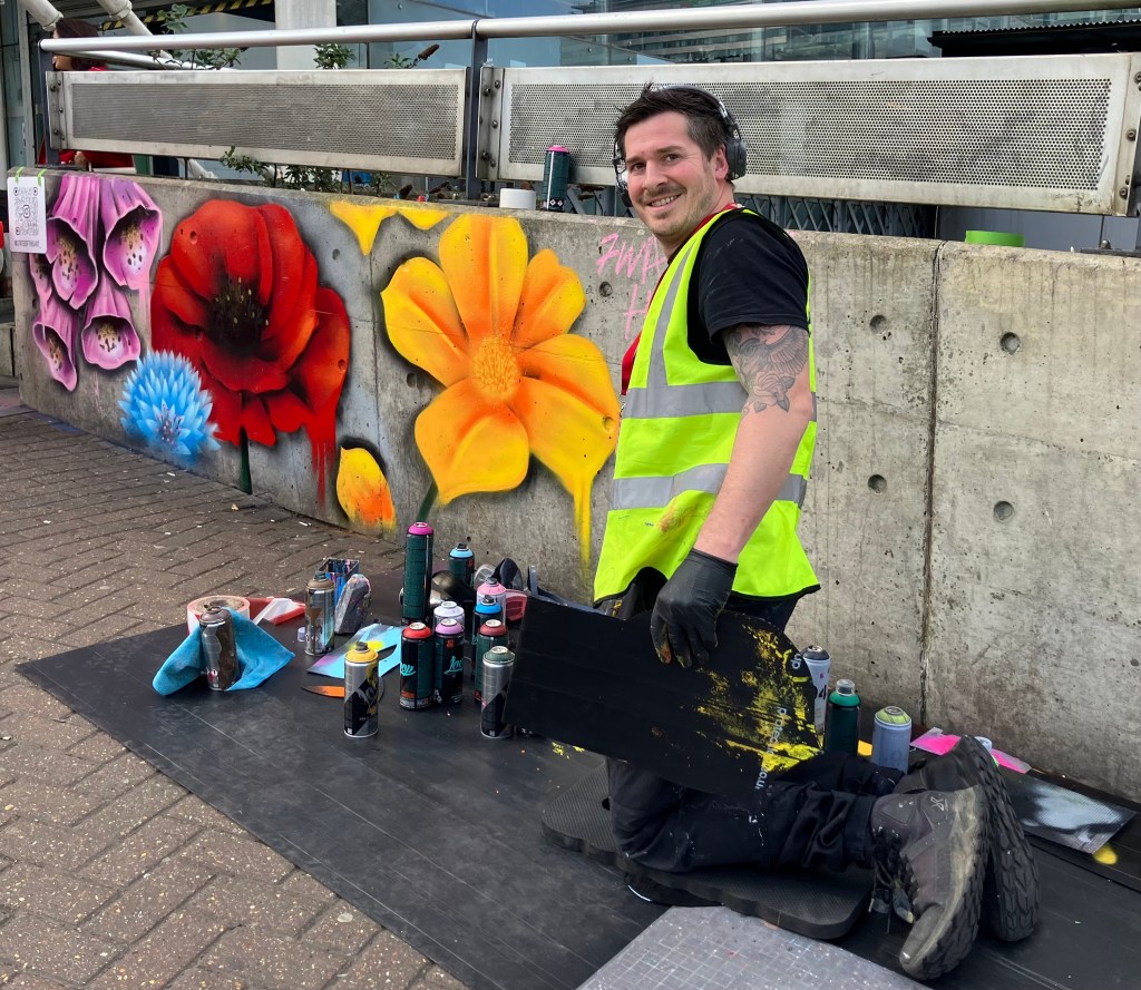 Last Saturday, Chris painted the southern part of the wall leading up to East Croydon station, combining local wild flowers with images of station staff. His work was funded by grants from Govia Thameslink and Kew gardens.