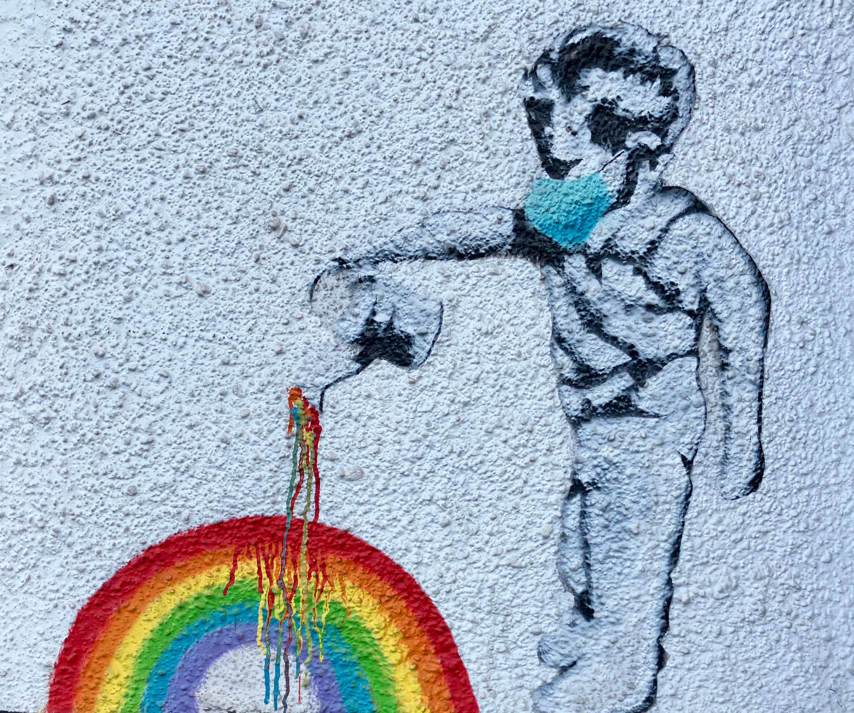 Some of you might know Chris Shea’s artwork from the COVID lockdown, when he painted a small boy watering a rainbow on many local buildings (the one below can still be seen on the facade of Little Bay, South End). The money paid by the recipients raised over £30,000 for NHS charities.