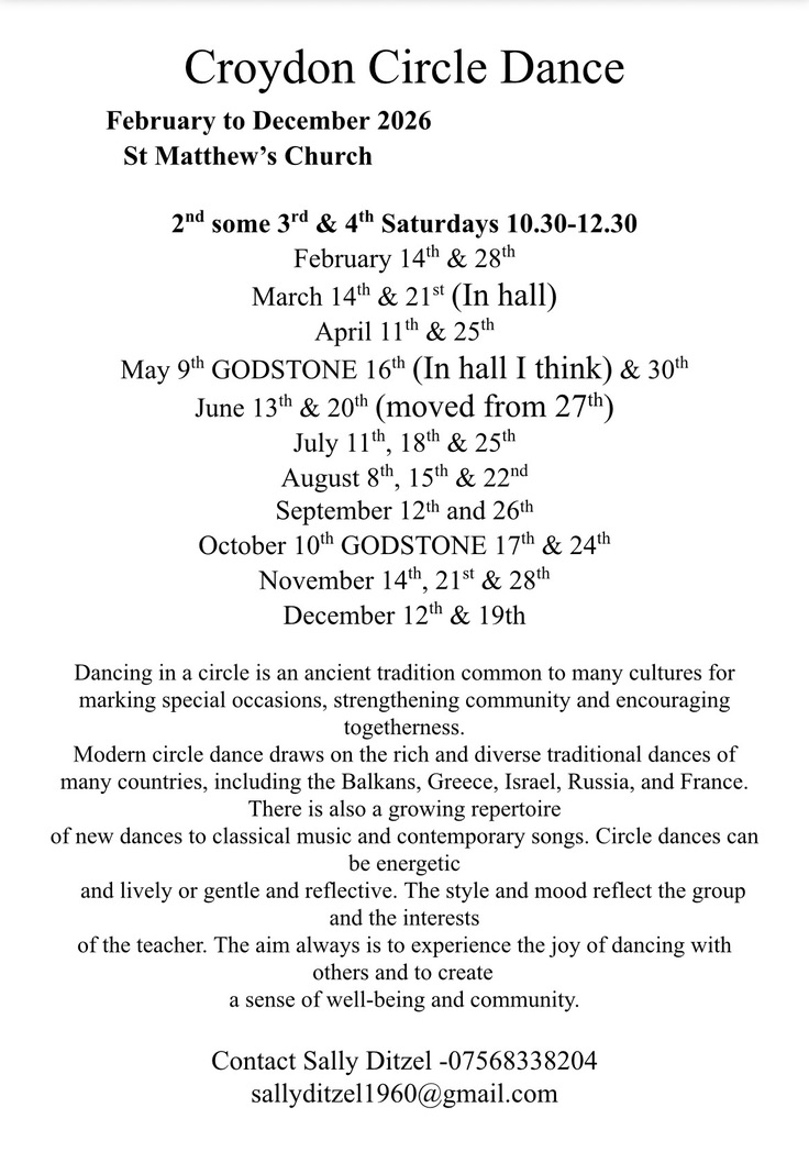 Circle dancing 10.30am Saturday, 25 April at St Matthews Church, Chichester Road #croydon Apr 22, 2026 · by eastcroydon · in Sport & Leisure. · Share this: Share on X (Opens in new window) X Share on Facebook (Opens in new window) Facebook Share on Bluesky (Opens in new window) Bluesky Share on Nextdoor (Opens in new window) Nextdoor Like Loading... Related
