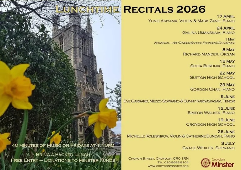 Classical music recitals 1.10pm Fridays until 3 July at Croydon Minster, Church Street #croydon Apr 23, 2026 · by eastcroydon · in Sport & Leisure. · More information https://www.croydonminster.org/events/ Share this: Share on X (Opens in new window) X Share on Facebook (Opens in new window) Facebook Share on Bluesky (Opens in new window) Bluesky Share on Nextdoor (Opens in new window) Nextdoor Like Loading... Related
