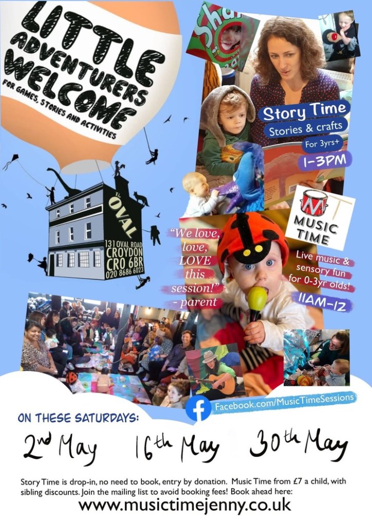 Music Time for 0-3 year olds & Story Time for 3 years+ on Saturdays 2, 16 and 30 May at The Oval Tavern, 131 Oval Road #croydon Apr 26, 2026 · by eastcroydon · in Family & Education. · More information https://www.musictimejenny.co.uk/croydon Share this: Share on X (Opens in new window) X Share on Facebook (Opens in new window) Facebook Share on Bluesky (Opens in new window) Bluesky Share on Nextdoor (Opens in new window) Nextdoor Like Loading... Related