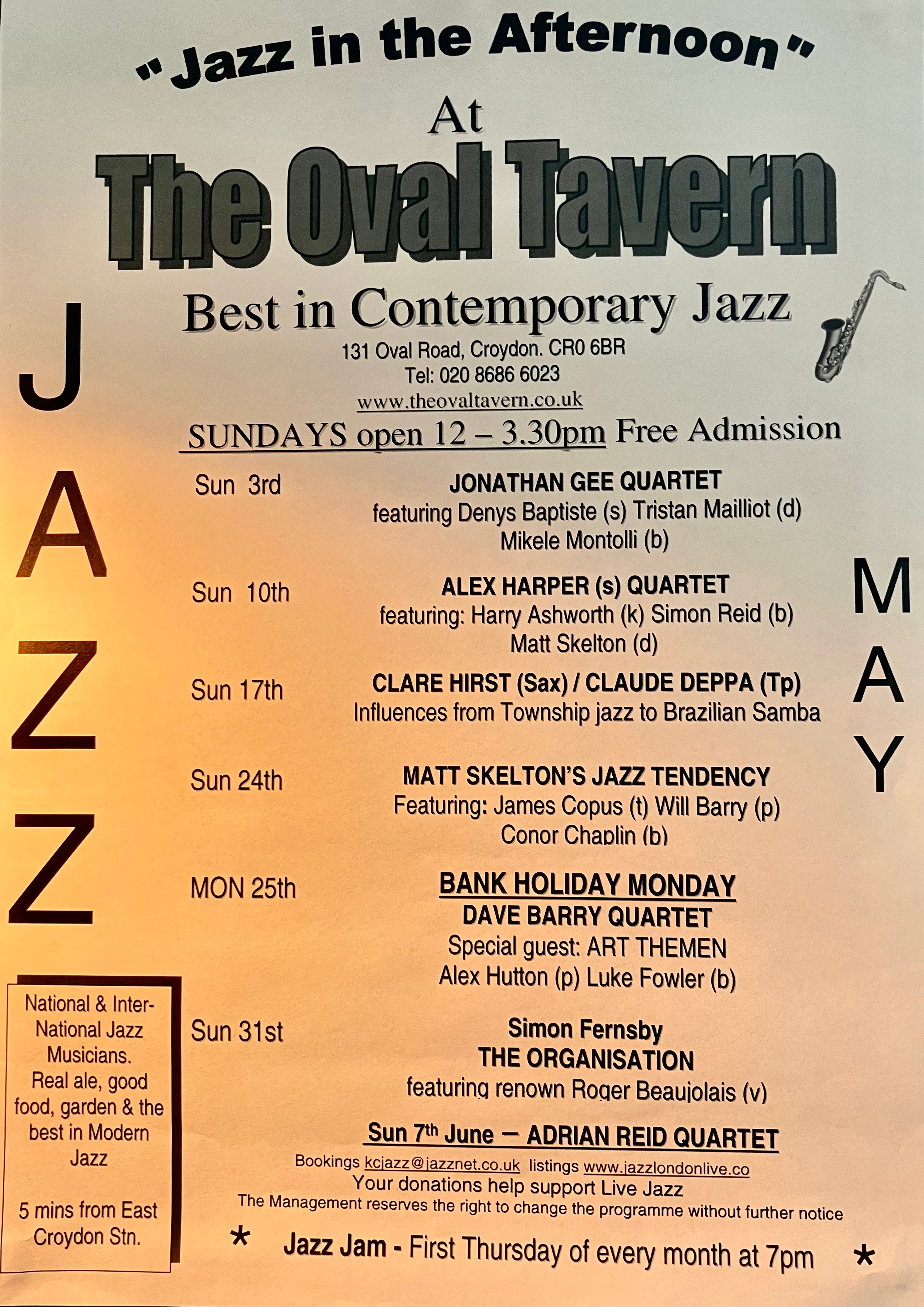 Jazz in May 2026 at The Oval Tavern, 131 Oval Road #croydon Apr 27, 2026 · by eastcroydon · in Sport & Leisure. · Share this: Share on X (Opens in new window) X Share on Facebook (Opens in new window) Facebook Share on Bluesky (Opens in new window) Bluesky Share on Nextdoor (Opens in new window) Nextdoor Like Loading... Related