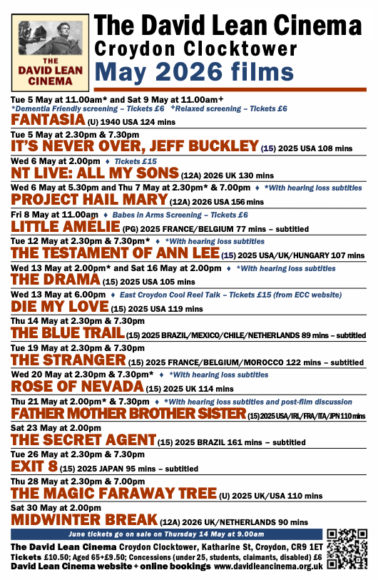 Films in May 2026 at The David Lean Cinema, Katharine Street #croydon Apr 28, 2026 · by eastcroydon · in Sport & Leisure. · More information https://www.davidleancinema.uk/#whatson Share this: Share on X (Opens in new window) X Share on Facebook (Opens in new window) Facebook Share on Bluesky (Opens in new window) Bluesky Share on Nextdoor (Opens in new window) Nextdoor Like Loading... Related