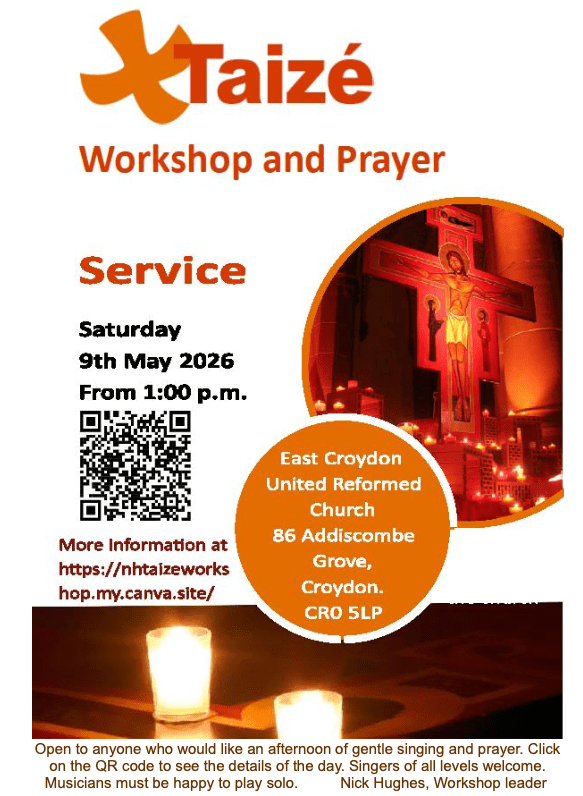 Taize workshop & prayer 1pm Saturday, 9 May at East Croydon United Reformed Church, Addiscombe Grove #croydon Apr 28, 2026 · by eastcroydon · in Faith & Charity. · Share this: Share on X (Opens in new window) X Share on Facebook (Opens in new window) Facebook Share on Bluesky (Opens in new window) Bluesky Share on Nextdoor (Opens in new window) Nextdoor Like Loading... Related