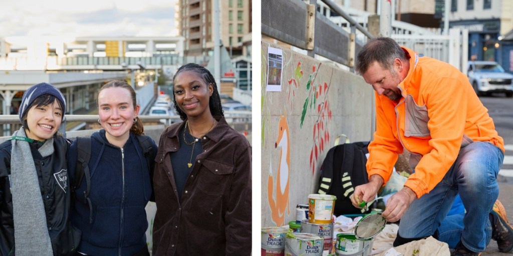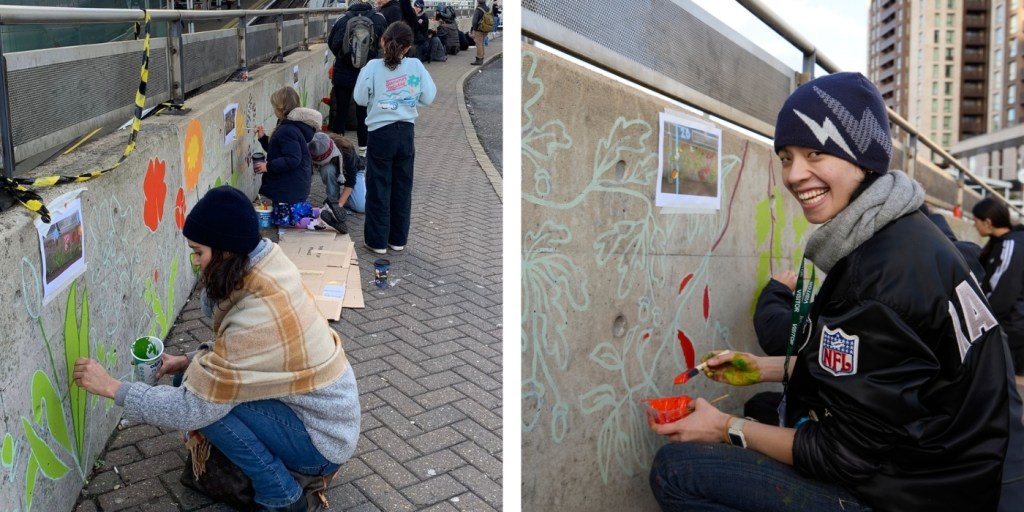 Ellie: For me, this is local people. Seeing families, friends and complete strangers stop, ask questions and even pick up a brush has been incredible. There’s been a real sense of shared ownership, and watching the mural grow from a blank wall into something colourful and meaningful has been genuinely joyful. On our main painting day on 30 November, a group came together to help bring the mural to life – some for a few minutes, others for several hours. Some had lived nearby for decades, others for just a few months. Everyone’s contribution has made it a truly collaborative and community-focused effort.