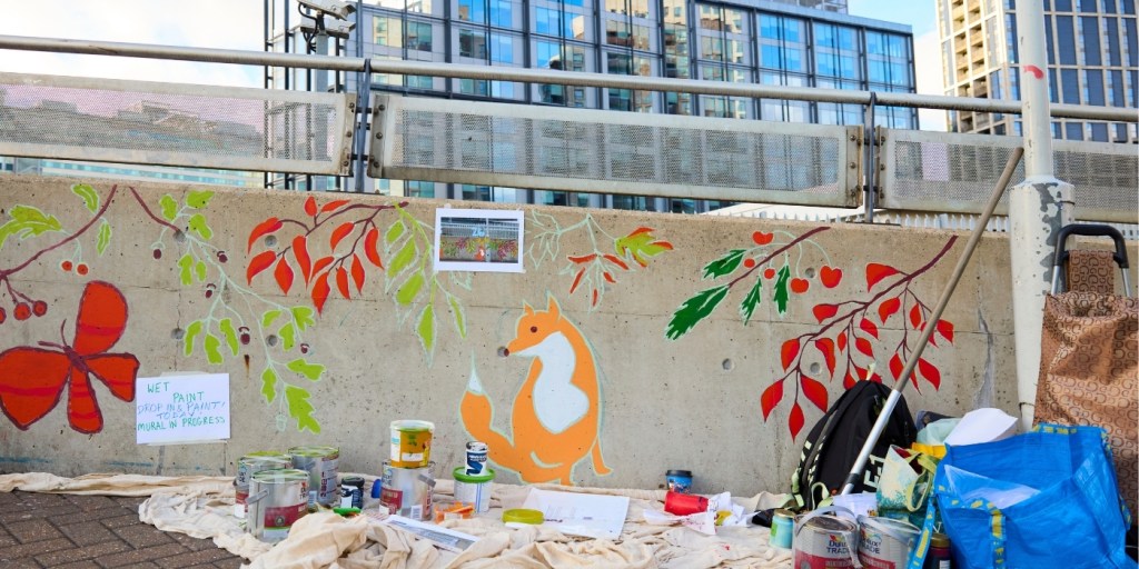 Ellie: Working in a busy, public, open space brings challenges (such as weather and safety), as does coordinating many people with different daily routines. There’s also the need to ensure that the mural is accessible and representative. But those challenges are part of what makes it meaningful and rooted in the real life of the area.