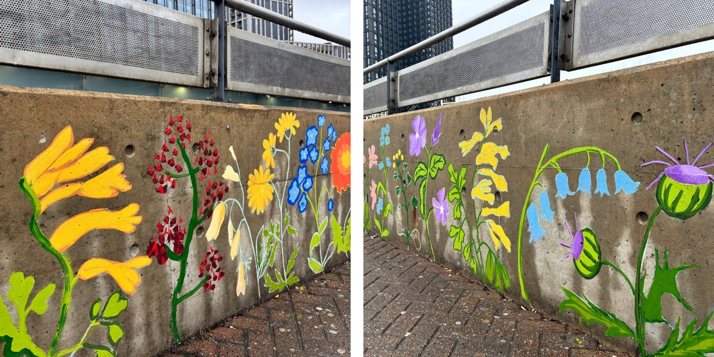 Max: In the autumn of 2024, I made a bid to Govia Thameslink Railways (GTR) Station Improvement fund. This outlined how Billinton Hill could be improved for pedestrians and cyclists, as well as motorists. A wildflower mural along the concrete wall along the west of the street was one of the suggestions. This was inspired by the flower murals outside London Bridge Station, designed and produced by Imelda Cox in 2021. These included flowers that appeared to be growing in the cracks between the pavement and the wall. As the ECCO area has no public open space, this is where many of our local wildflowers can be seen.