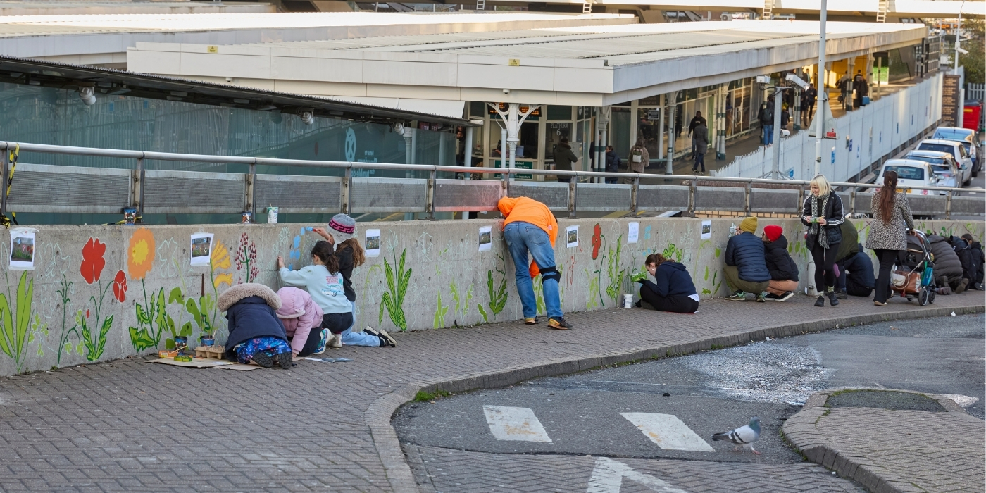 Ellie: For me, this is local people. Seeing families, friends and complete strangers stop, ask questions and even pick up a brush has been incredible. There’s been a real sense of shared ownership, and watching the mural grow from a blank wall into something colourful and meaningful has been genuinely joyful. On our main painting day on 30 November, a group came together to help bring the mural to life – some for a few minutes, others for several hours. Some had lived nearby for decades, others for just a few months. Everyone’s contribution has made it a truly collaborative and community-focused effort.