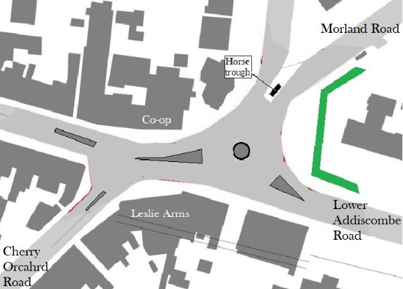 - The possible layout demonstrated below pulls the Morland / Lower Addiscombe Road corner further east, allowing its separation from the entrance from Cherry Orchard Road.