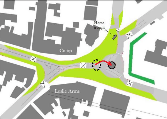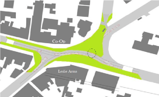 The Leslie Arms Junction as it is now with much of the area taken up by road and traffic islands. Very thin pavements are a problem on all sides of the junction.
