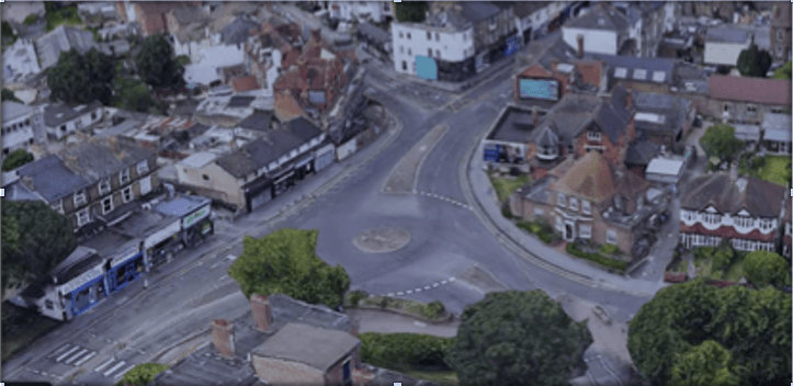 The junction seen from above. Notice the huge amount of space taken up by the roundabout and the large traffic islands designed and built at a time when the car was king. Note the very tight pavements, especially when compared to the wide roads. At the top is the confusing part of the junction where there are so many crashes.