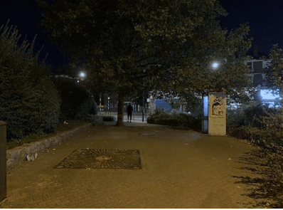 The pavements at night. Poorly lit, very thin with dumped rubbish. We try not to visit after dark.