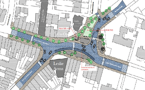 This vision to regenerate the area around the Leslie Arms Junction is the product of people in the local community who desperately want a more welcoming and safer place to shop which could become a community hub as well as just a thoroughfare for cars. Crucially, it needs to be easy and safe for use by pedestrians and cyclists as well as allowing smooth flow of road vehicles.