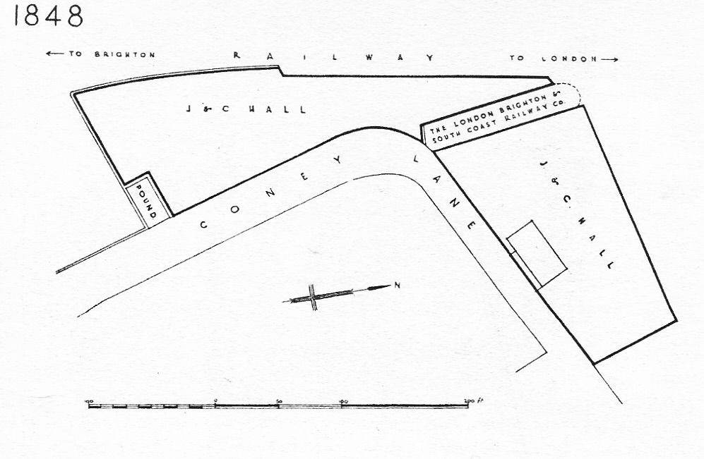 In 1845, George Hall built himself a house of Merstham stone across the road from his depot. However, it is not clear whether he lived in it, as he died in December that year. George’s three sons (James, Joseph and Charles) formed a partnership, trading as J. J. and C. Hall. Three years later, the company had expanded the wharf south to the edge of the pound, formerly used to hold cattle straying from Croydon Common onto Coney Lane.