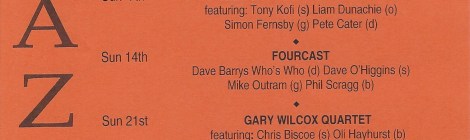Sunday, 26 May: Ian East Trio with Jonathan Ward and Stephen Bridgland Monday, 27 May: Art Themen quartet Sunday, 2 June Sam Dunn Quartet, featuring Dave O’Higgins