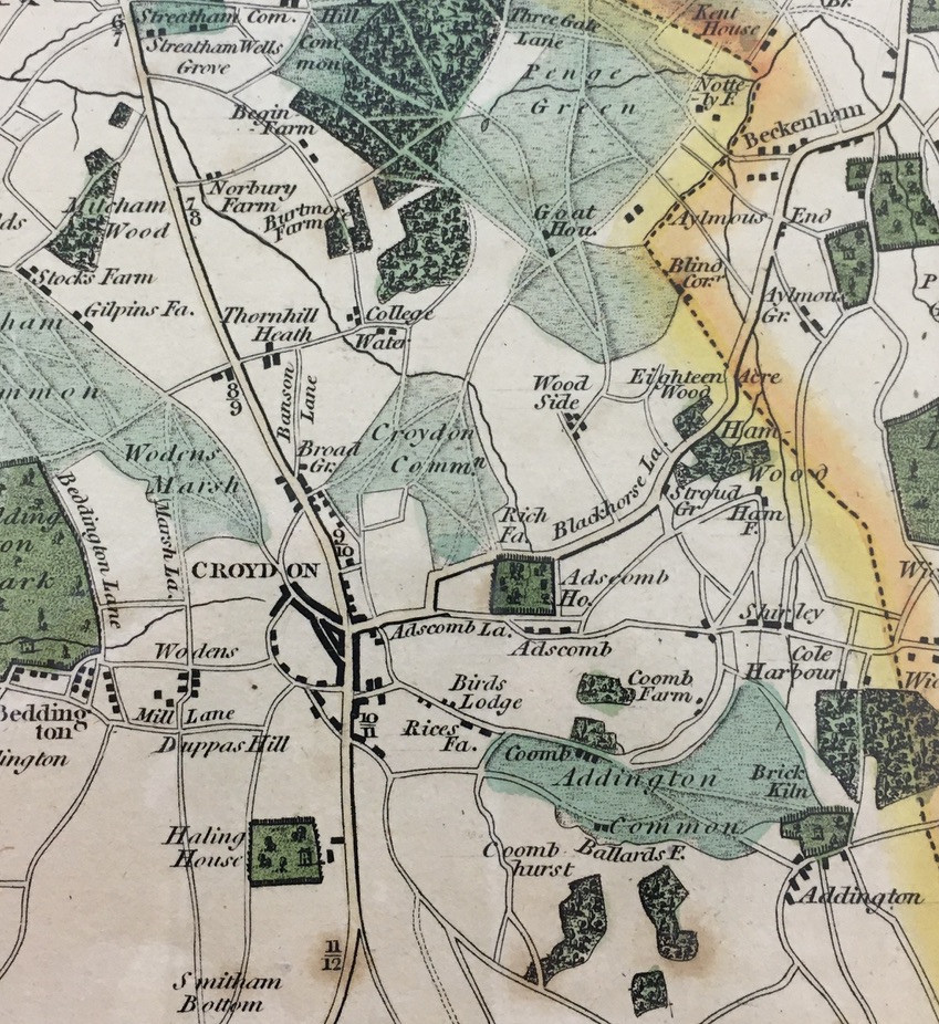 Croydon Common covered 280 acres, less than a tenth of the common land in the parish of Croydon before it was enclosed. The map above shows part of the Common’s southern edge abutting on what is now the northern stretch of Cherry Orchard Road. One track across the common ending here lies along the route later followed by Cross Road. Another track cuts across from the north west, following the later line of Lower Addiscombe Road. Detail from a map of London, published by John Fairburn in 1798(Reproduced courtesy of The London Archives, City of London Corporation).