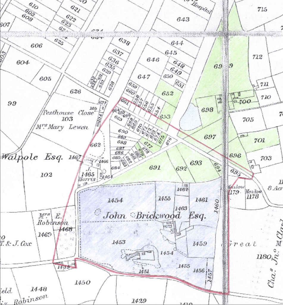 Map of John Brickwood holdings before (purple) & after (green) the enclosure act – in and around the area covered by the East Croydon Community Organisation (boundary in red). The blue area next to plot 698 was a public pond. Based on a detail of A Plan of the Parish of Croydon in the county of Surrey shewing the allotments in the Common and common fields as divided by an Act of Parliament in the year 1800 and https://london-road-croydon.org/history/sources/enclosure/croydon-enclosure/.