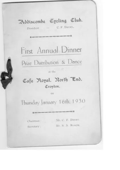 As reported in a local paper, Davey was keen to promote the social side of the cycling club as well as the racing. In January 1930, he organised the first Addiscombe annual club dinner at the Café Royal in North End. A “humorous talk” was given by Mr Bartleet, the chair of the Belle Vue Cycling Club. Not to be outdone, Davey, also the host club’s president, provided the musical entertainment being described as “an accomplished tenor”. Was there no end to his talents?