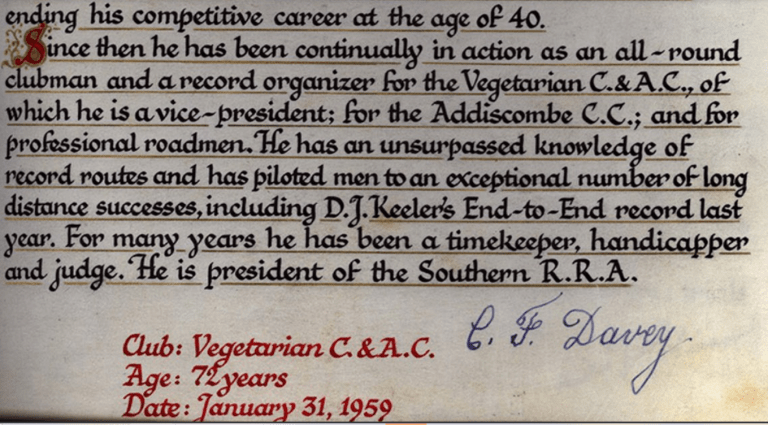 In 1959 and by now in his 70s, Charlie Davey was rewarded for a lifetime of achievement by being given an entry in The Golden Book of Cycling. It was a glowing tribute which marked a lifetime of racing, coaching, managing and officiating in the sport. It was said that he had an unsurpassed knowledge of the routes of long-distance record attempts, and his organisation and officiating brought a huge degree of professionalism to each event.