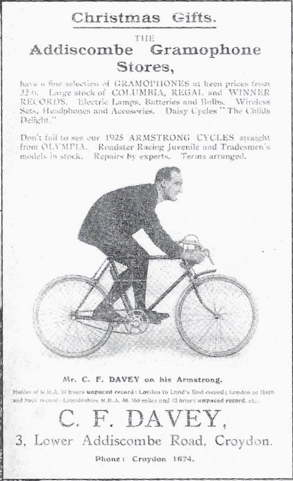 Charlie Davey was a world championship medal-winner and Olympic cyclist. He took over a shop selling gramophones at 3 Lower Addiscombe Road in 1925 and started selling cycles alongside them. The business was still open in 1955, but the premises (next to the Mei Fo House Chinese take away) have since been converted to housing. However, the Addiscombe Cycling Club, to which he belonged, is still going strong.