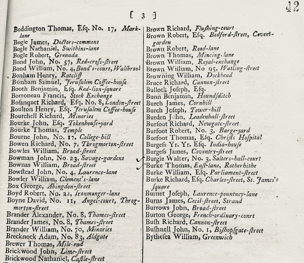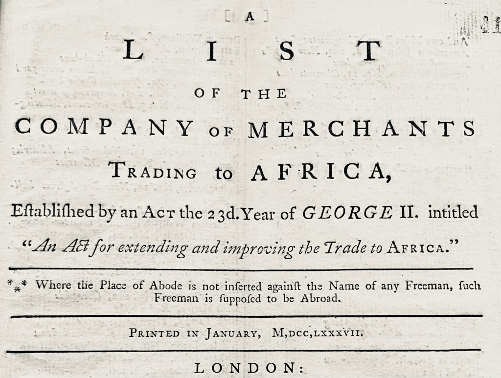 In 1787, John Brickwood and his brother Nathanial are listed as London members of Company of Merchants Trading to Africa. As such they would have had more direct involvement in the trade in enslaved people. John Stables of Park Hill also appears on the list (as he did in 1778).