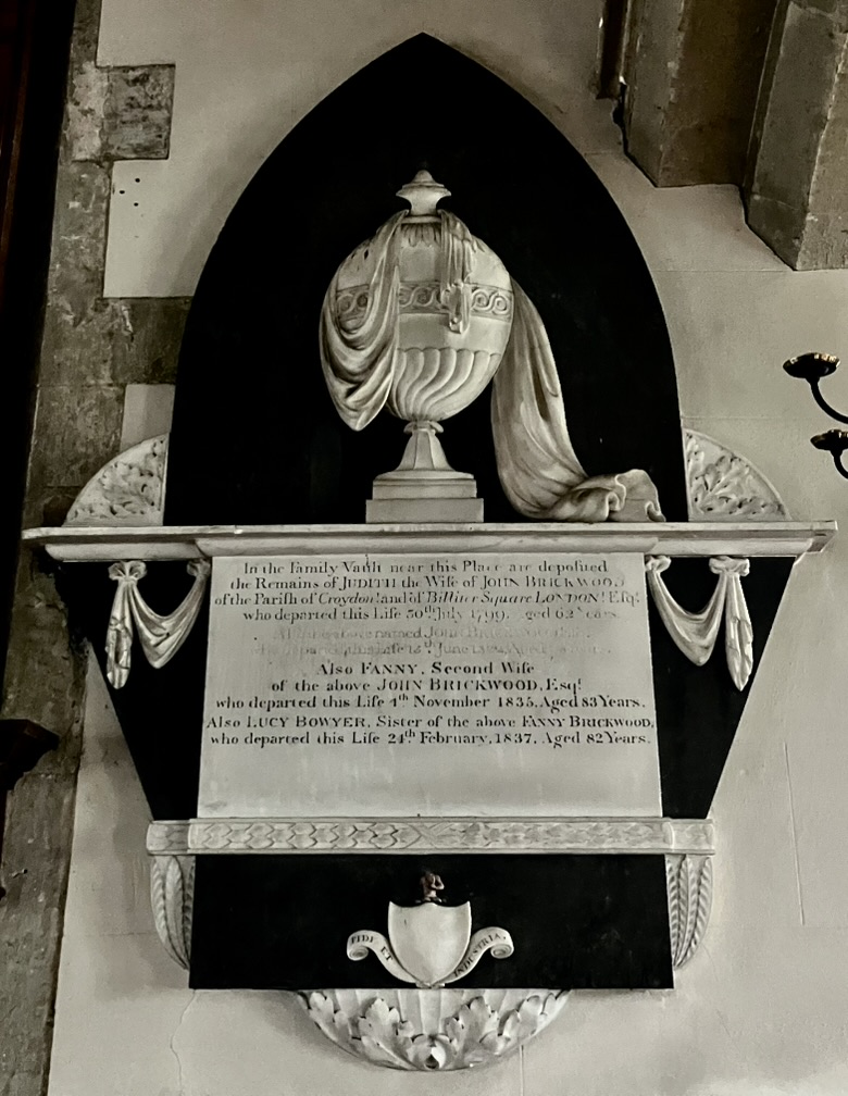Many thanks for their help to the staff of the Public Records Office, London Metropolitan Archive, Surrey Records Office, Kew Gardens Archives, Lambeth Palace Record Office and Croydon Archives. All Saints Church kindly provided some valuable information about the Brickwood memorials within, Brenda Hawkins better data about Brickwood’s birth & family, Kake Pugh evidence of Brickwood’s ownership of land in Croydon as early as 1791 and Tony Skrzypczyk some much needed images.