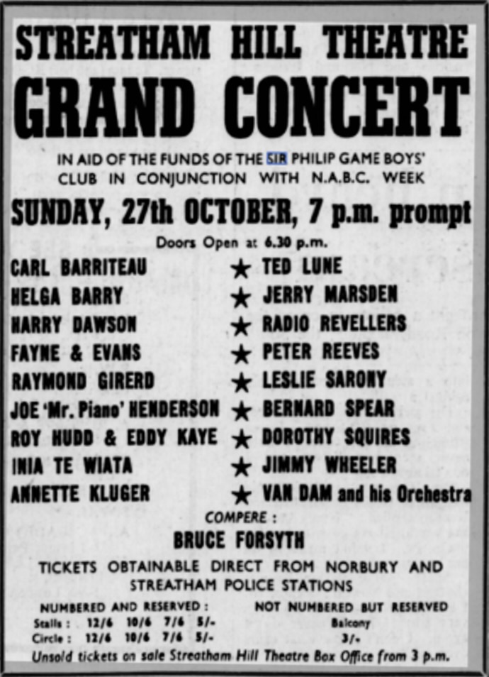 Throughout the 1950s, these super fundraising concerts continued. In 1953, Streatham Hill Theatre hosted the event, with Michael Bentine and Bob Monkhouse (who lived in the area at the time) the star comedians, together with a burst of Cross Hand Boogie from pianist Winifred Atwell. With tickets on sale from Norbury and Croydon police stations, audiences would flock from across London.