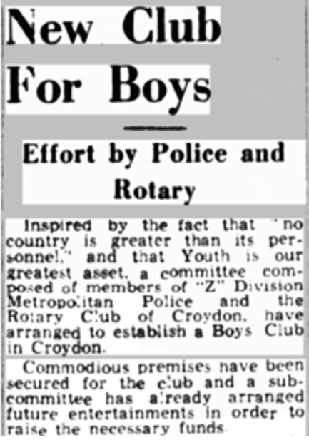 “No country is greater than its personnel. Youth is our greatest asset.” These were two of the conclusions from a committee which met in 1944, worried about the boys in Croydon and what sort of men they would grow into. The same sentiment is probably held by many today. The committee back then was comprised of members of Z Division of the Metropolitan Police and the Rotary Club of Croydon. The outcome of the meeting was that they decided that Croydon needed a boys’ club.